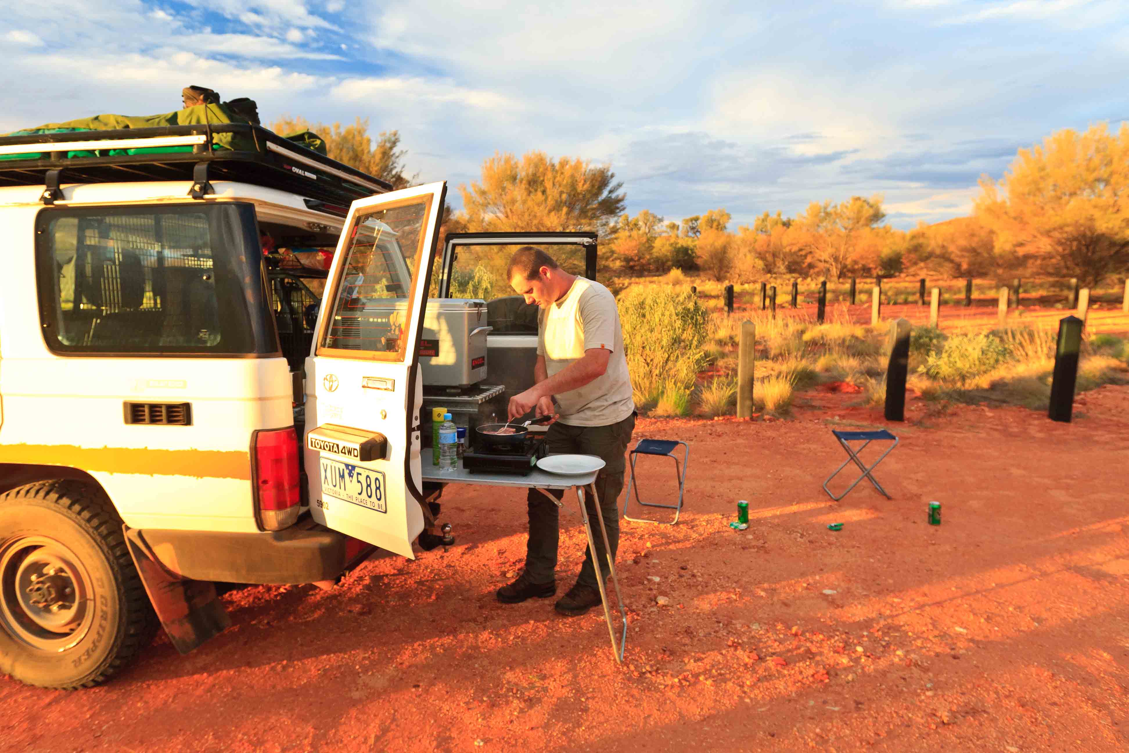 Na het eten rijden we verder over de Old Ghan Track en slaan na een paar uur rechtsaf richting Chambers Pillar. Om er te komen moeten we 47 km over een mulle rode zandweg vol stijle duinen rijden. Het is een leuke maar vooral ook mooie rit. Vroeg in de avond komen aan en installeren ons op het bijgelegen Buscamp midden in de Outback. Het is er doodstil, alleen de vogels maken geluid. Hier slapen we vannacht maar eerst gaan we lamb chops bakken en eten bij een schitterend fel ornaje ondergaande zon.