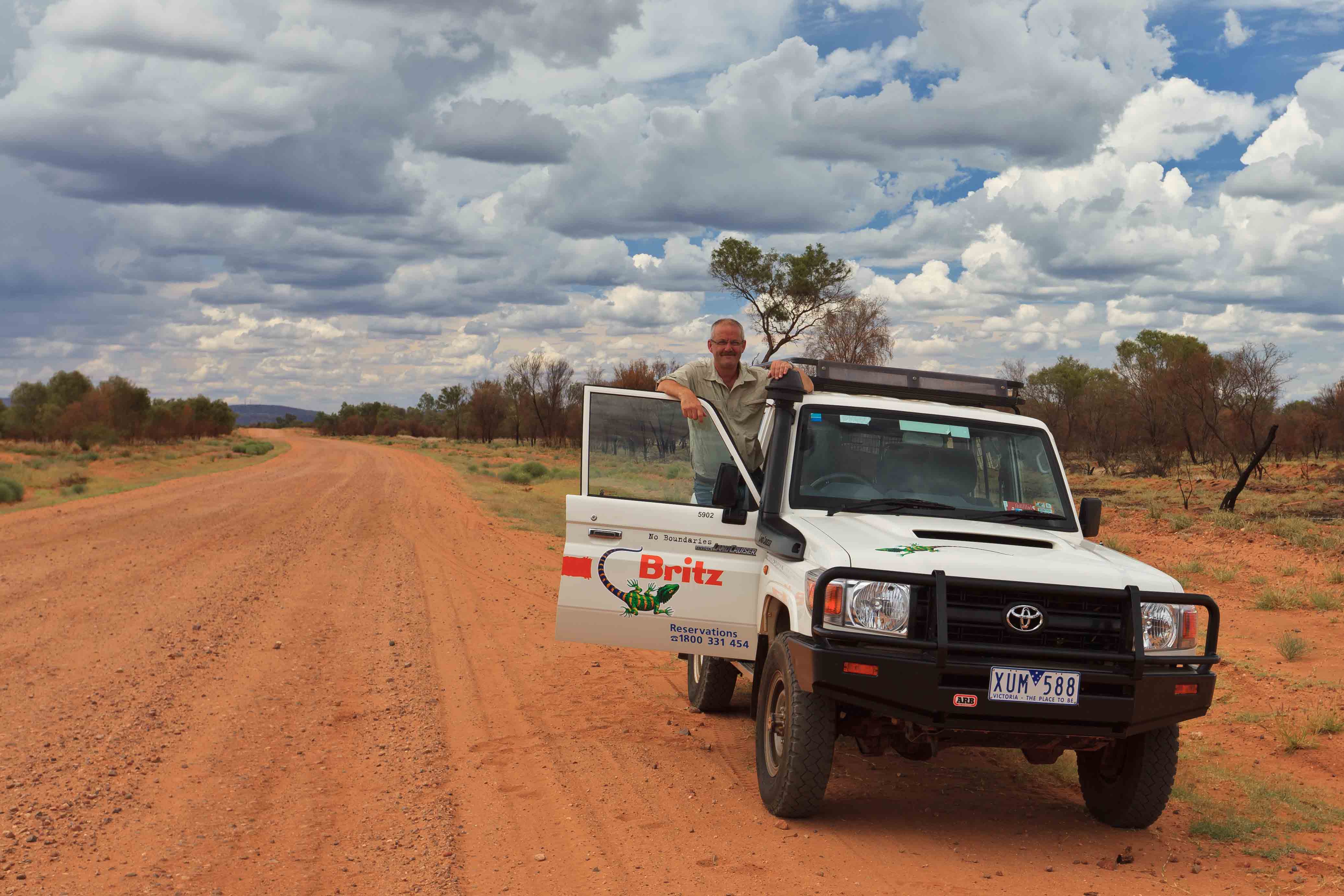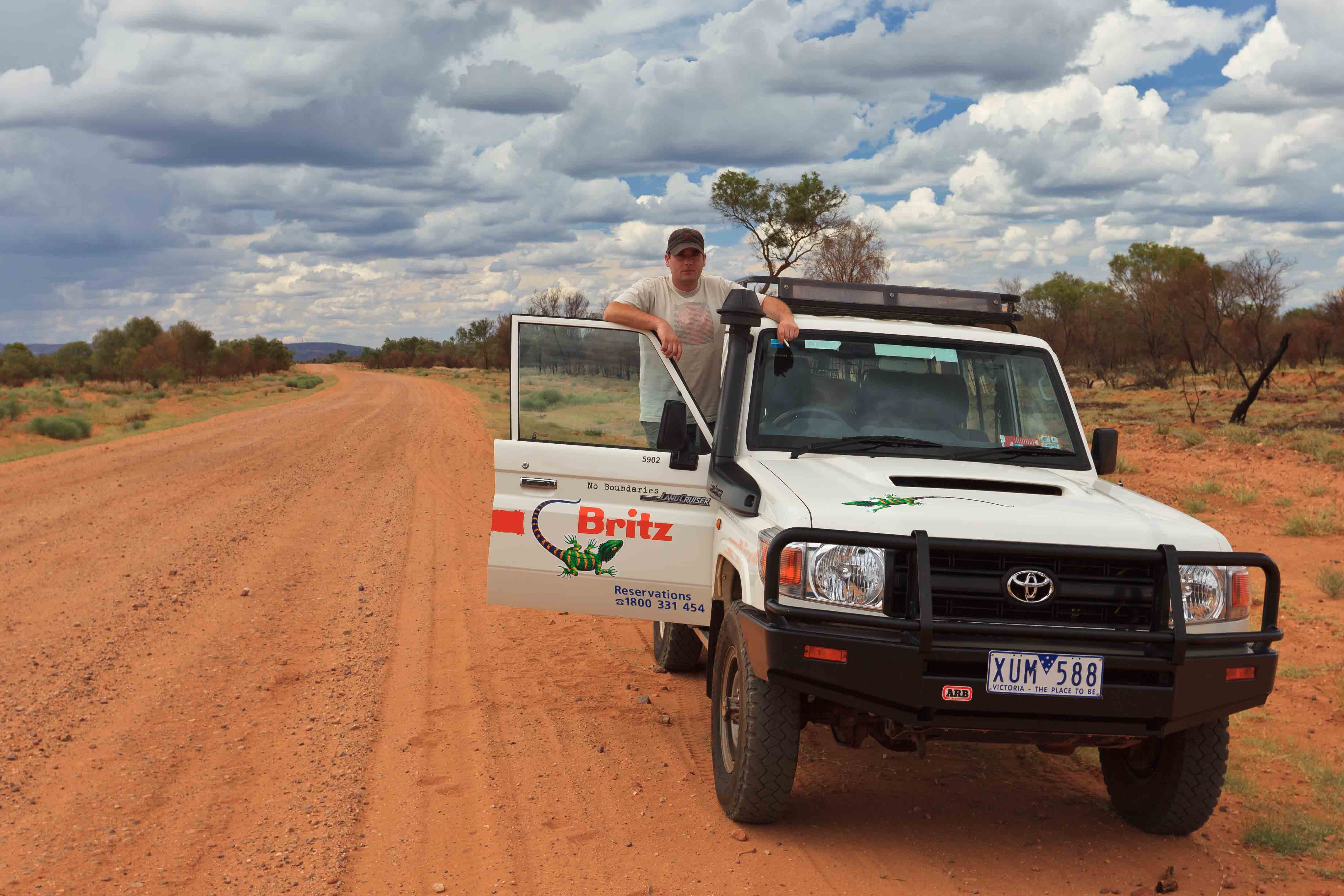 Om 9.00 opgestaan en om 9.45 uur uit het hotel vertrokken om de gehuurde 4WD op te halen bij Britz. Op de kaart leek het niet ver van het hotel te zijn dus zijn we er lopend naar toe gegaan. Dat bleek toch niet zo'n goed idee. Het was ruim eem uur lopen in 40 graden en een rugzak om en natuurlijk geen water meegenomen. Na aankomst bij Britz werden de nodige papieren geregeld en nog een extrz verzekering afgesloten. Daarna moesten we verplicht een insructiefilmpje volgen. Daarin werden we er o.a. nog eens op gewezen dat je bij pech altijd bij je auto moet bliven en hoe je bij een slangenbeet moest handelen. Onze auto was uitgerust met een EPIRB een apparaat dat in noodgevallen ingeschakeld kan worden waarbij je positie per sateliet wordt doorgegeven aan een alarmcentrale. Geen overbodige luxe als je de Outback van Australië intrekt. De auto beschikt verder over een drinkwatertank van 25 liter en een koelkast.