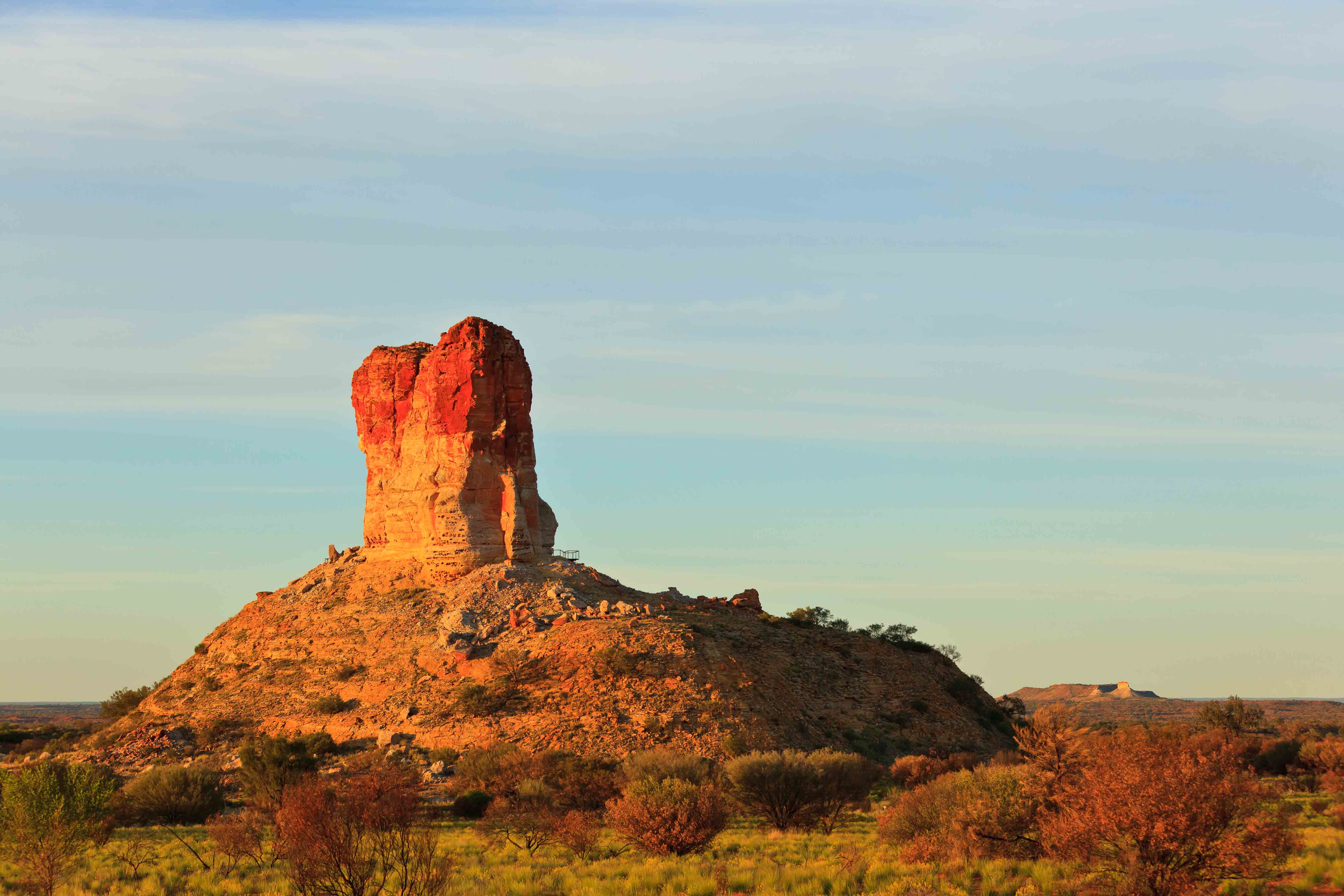 Ons eerste reisdoel is "Chambers Pillar", een grote alleenstaande pilaar.