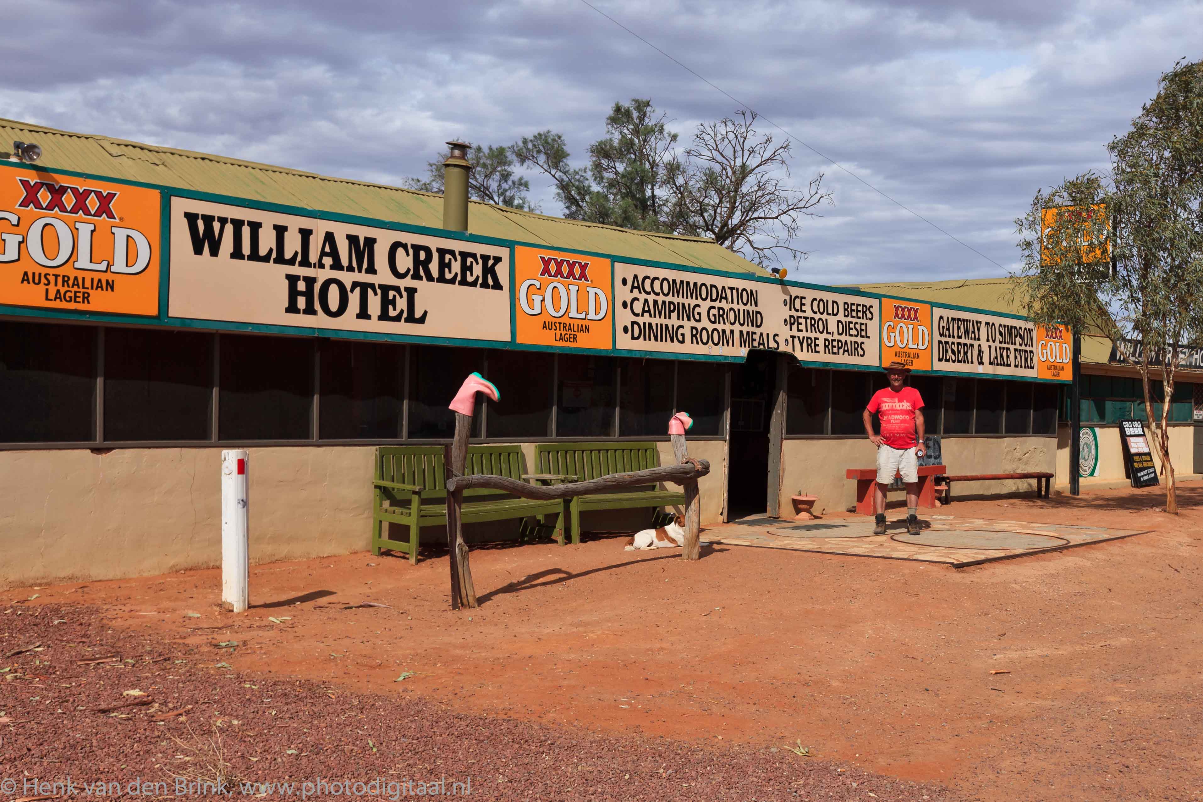 Gelukkig bereiken we William Creek verder zonder problemen. We tanken er en het wiel met de lekke band wordt omgeruild. We maken er ook kennis met Trevor Wright. Die zonder dat we er om vragen vertelt dat hij piloot is en in Vietnam gevlogen heeft. We kijken hem aan vragen natuurlijk "Met wat voor toestel"?. Hij beantwoord de vraag niet maar gooit het over een andere boeg. Hij begint er over dat hij in de avond kangeroes gaat schieten. Daarbij kennelijk in veronderstelling dat hij ons daarmee chockeert. Rudie vraag meteen of hij een geweer kan lenen zodat hij met hem mee kan. Trevor is gelijk stil. Zijn stoerdoenerij slaat niet aan en hij druipt af.